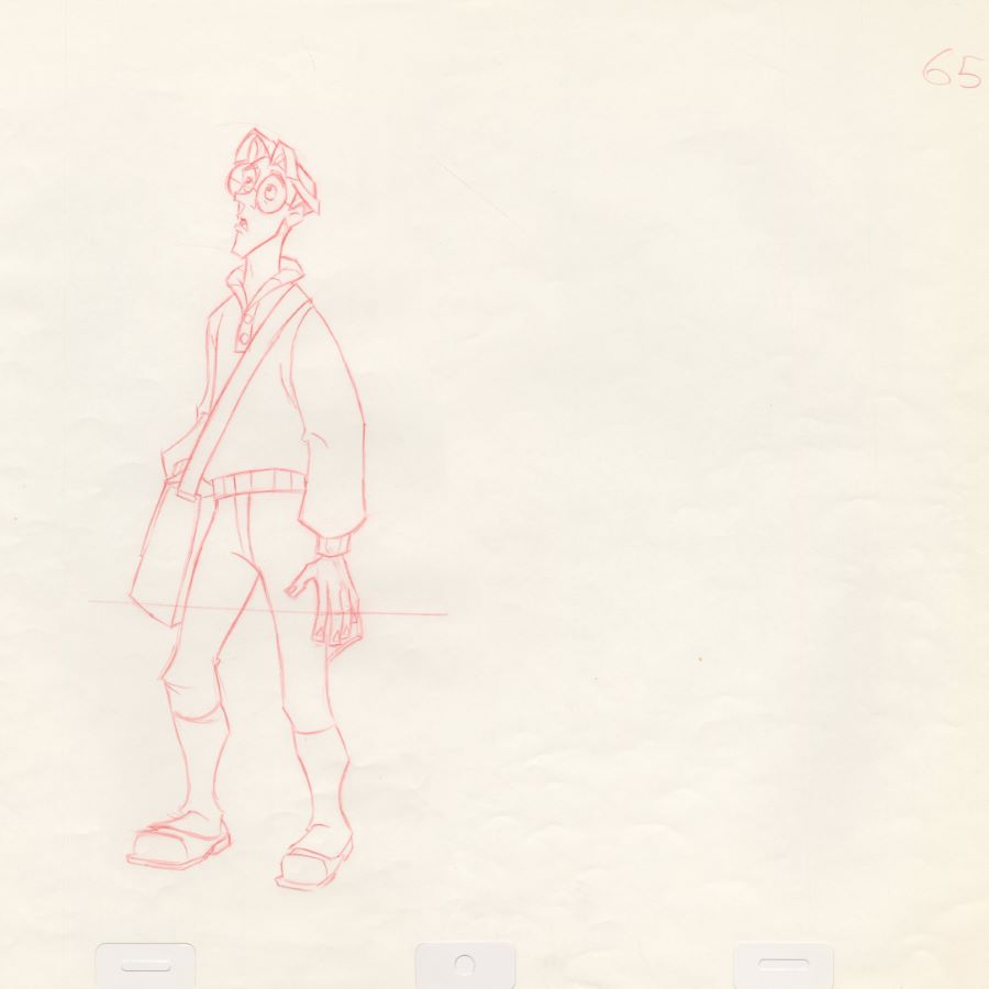 A production drawing from the Disney Studios animated film "Atlantis: The Lost Empire" (2001). Featuring Milo Thatch embarking on his journey, the graphite drawing was created at the studio and used during the animation process. Measuring 12.5"x17" overall, with the character image measuring 9.5"x3", the drawing is in very good condition with light handling-related wrinkling and age-related paper discoloration.
